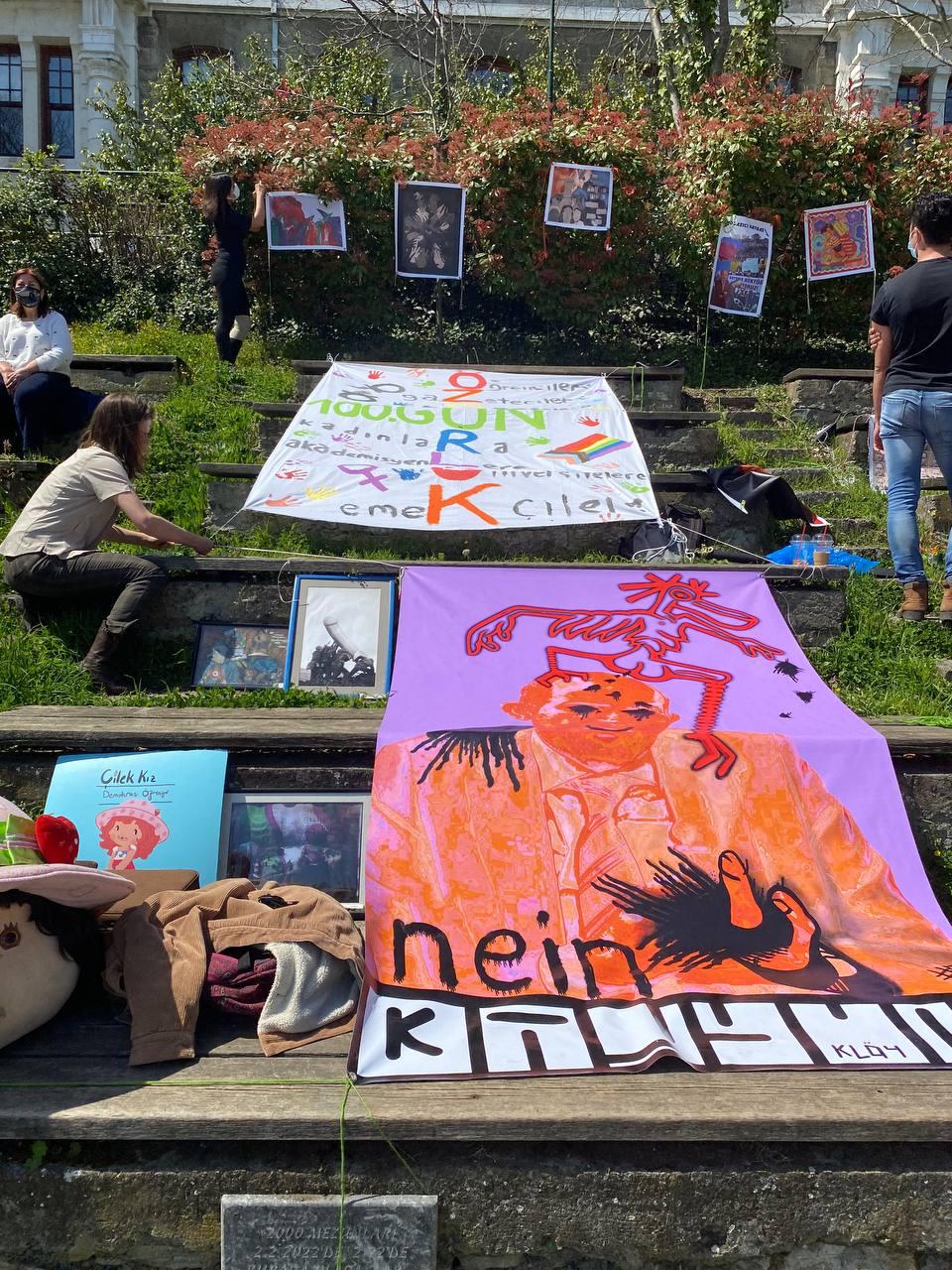 Peki sanatı bizler bugün nerede görüyoruz? İçinde bulunduğumuz şartların bakışlarımıza hakim olduğu üzere ayrımcılıklar, eylemler, şiddet gibi konuların içinde görüyoruz sanatı. Eylemlerimizin içinde ya da eylemlerimizi sanatın içinde görüyoruz. Biz eylemlerimizle zaman yaratıyorsak ki Boğaziçi Üniversitesi’nde 100 günü aşkındır yaptığımız şeyin adı tam olarak bu: bir zaman yaratmak, biz bu yaratıcılığın içinde sanatı da besliyoruz ve eylemler de sanattan besleniyor. Eylemlerin en unutulmaz olaylarından birisi kimsenin göz ardı edemeyeceği bir şekilde BounSergi’nin kampüs içerisinde açtığı sergi oldu. Tüm eylem alanımızı dönüştürdüler, tüm şiddet, nefret, korku silindi o hafta kampüste, çünkü yukarıda yaptığımız tanımda da söylediğimiz gibi bugünün içinden çıkmış olan o sanat eserleri çimlerimizi binalarımızı donattı. Bu şekilde eylemler kendi yansımalarını gördü adeta ve aynı zamanda dış dünyadan ayrıksı tutulmaya çalışılan kampüs ortamı içine aldığı sanat eserleri ile aslında değil bir grup insanı içeriye almak bir zaman dilimini, bugünü, kampüsün içine soktu. Çünkü yazının öncesinde de konuştuğumuz üzere bir fırça darbesi isteyerek ya da istemeyerek yaşamın biriktirdiklerini vuruyor tabloya. Böylece sanatın nasıl bir yerde olduğu gayet net bir şekilde karşımızda duruyor. Aynı eserler kampüsün içinden alınıp mahkeme salonlarına taşındığında da içeriden dışarıya taşımamıza izin verilmeyen eylemlerimiz adliye koridorlarına polisler eliyle taşınmış oluyor ve çığlıklarımız, kararlılığımız ve inancımız biz bedenler olarak alınmasak da o koridorlarda eller üzerinde taşınıyor. İşte sanat tam olarak buna yarıyor, bir sembol olarak zamanı sırtlanıp, bizlere tüm gücüyle tanışma fırsatları yaratıyor. Zamana ve mekana direnerek anlatılarını sunuyor ve bağnaz tartışmalarda dahi yerini bularak güçleniyor. İşte bu sebepledir ki bir gün dönüp de bakıldığında bugünü anlatacak olanlar bir iktidar gözünün ürünleri olmayacak bizlerin eserleri olacak.